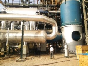 当該工場は石油産出の際の随伴ガスを原料にして、アンモニアを経て尿素を製造するプラント。2系列構成で、第一系列は1978年、第二系列は1979年に完成しました。その後、1991年と2003年の湾岸戦争やそれに伴う国連制裁の影響で交換部品の入手ができず老朽化し、2004年には肥料生産量が年間261,350トンと、設計年間生産量1,056,000トンの1/4程度に低下してしまっていました。機器や配管が変形していたり、更に一部の機器は内部の熱が外殻まで漏れてきていて外部からの放水で冷却しながら操業するなど危険な状態で、早急な改修が求められていました。