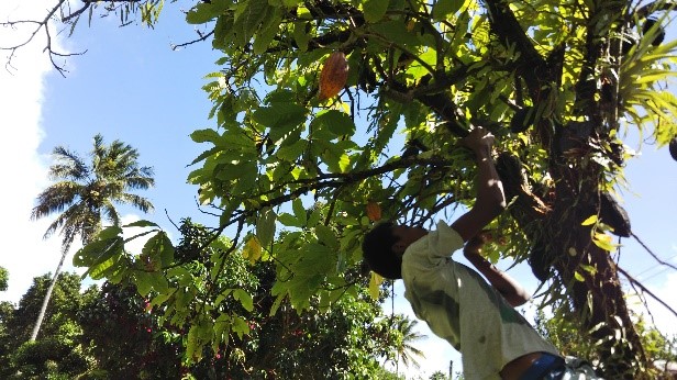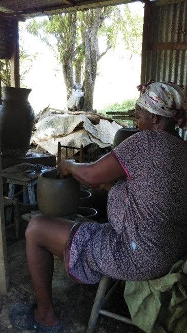 例えば、ショゼール地区の海沿いを通りかかったとき、ビーチでおばあさんが竹細工を編んでいるのを見かけました。そして、隣同士に住んでいる年配の姉妹はどちらも素焼きの陶器を作っていましたが、それぞれデザインや用途に特徴や違いがありました。一方で、スフレ地区の出展者は、なんと自宅の納屋の洗濯機のすぐ横でカカオスティック(カカオの実を発酵、乾燥、ロースト、粉砕し棒状に固めたもので、チョコレートドリンクの材料となる)を作っており、食品衛生の面で改善の余地がありそうです。