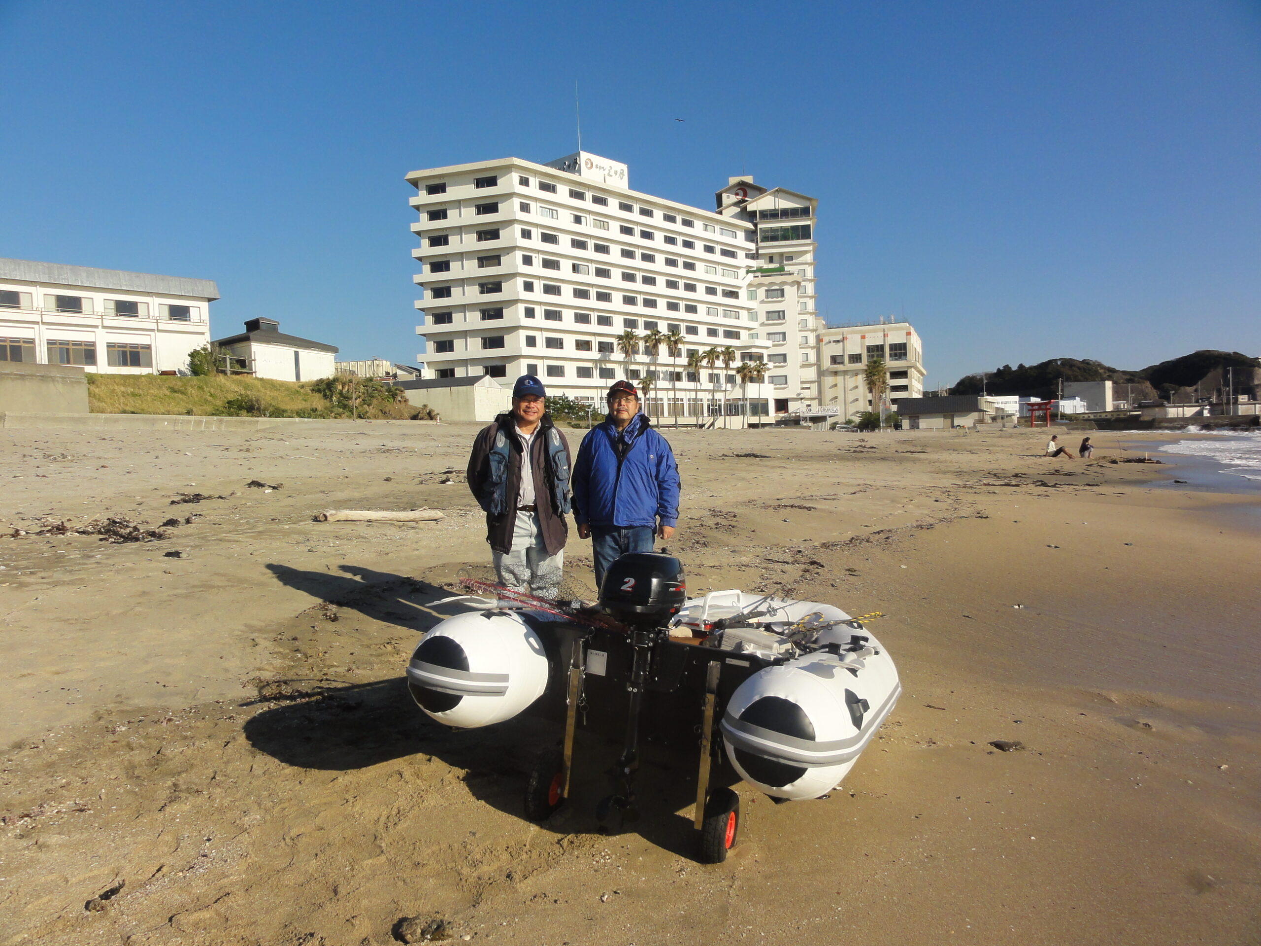 午後4時頃から勝浦港に隣接する“ホテル三日月”の近くの駐車場で、持参したゴムボート(4人乗り、2馬力エンジンとドーリー(2輪)付き)を組み立て、砂浜で遊ぶ家族連れを横目に勝浦湾の東側の岩場に向け出港しました。勝浦湾の東外側は隣の河津港まで半島状の断崖になっており、アジ等の魚の生息とともにその景勝のため高層マンションが高台に乱立している。私たちは過去の経験から夕まづめ(暮れゆく瞬間;我々はこれをオレンジタイムと呼んでいる)前後に多くのアジが外洋からこの岩礁の近くまで戻ってくることを知っていました。