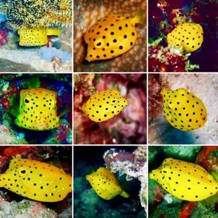 最後は、私の大好きなミナミハコフグの幼魚。魚の英名は面白い。箱フグだから、Boxfish。そして、この可愛い黄色に黒の水玉は幼魚の時のみ、大人になるとグレーに変色してしまうので、見つけたら、絶対に撮ります!本当に、すぐ岩場に隠れてしまうので、岩穴から出てくるまで待ちます。