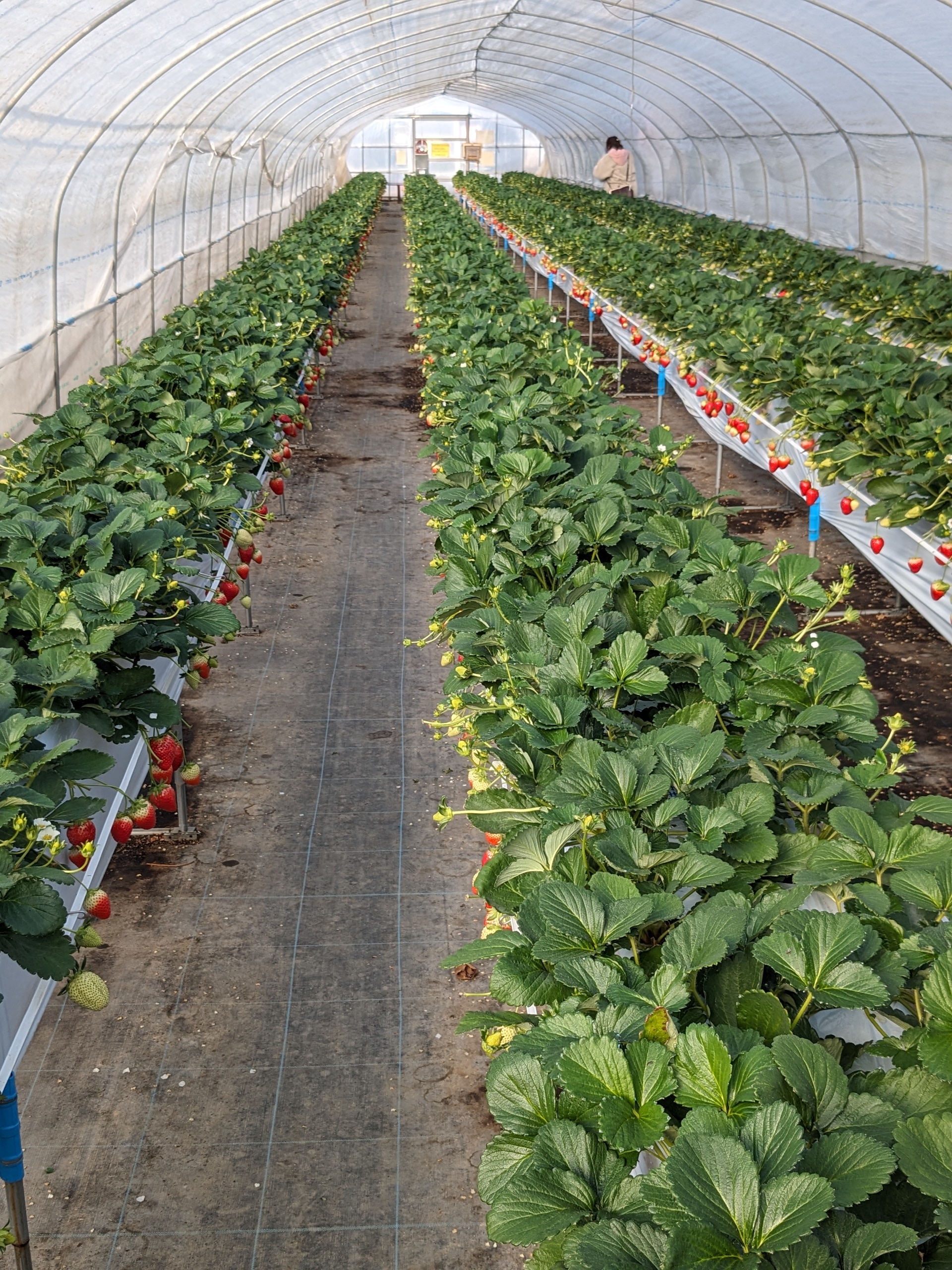 佐野観光農園では、「とちおとめ」、「とちあいか」、「スカイベリー」の3品種が栽培されており、気もそぞろに受付を済ませて暖かいビニールハウスに飛び込めば、そこは一面いちごのパラダイス!