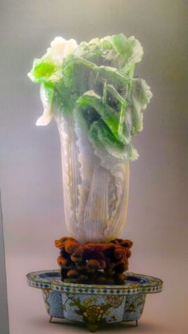 まず、故宮博物院ですが、なんと2大目玉展示物の「ヒスイの白菜キリギリスのせ」と「豚の角煮」(正式名称:翠玉白菜、肉型石)が他所に貸し出されていて、ポスターと画像で我慢することになりました。
